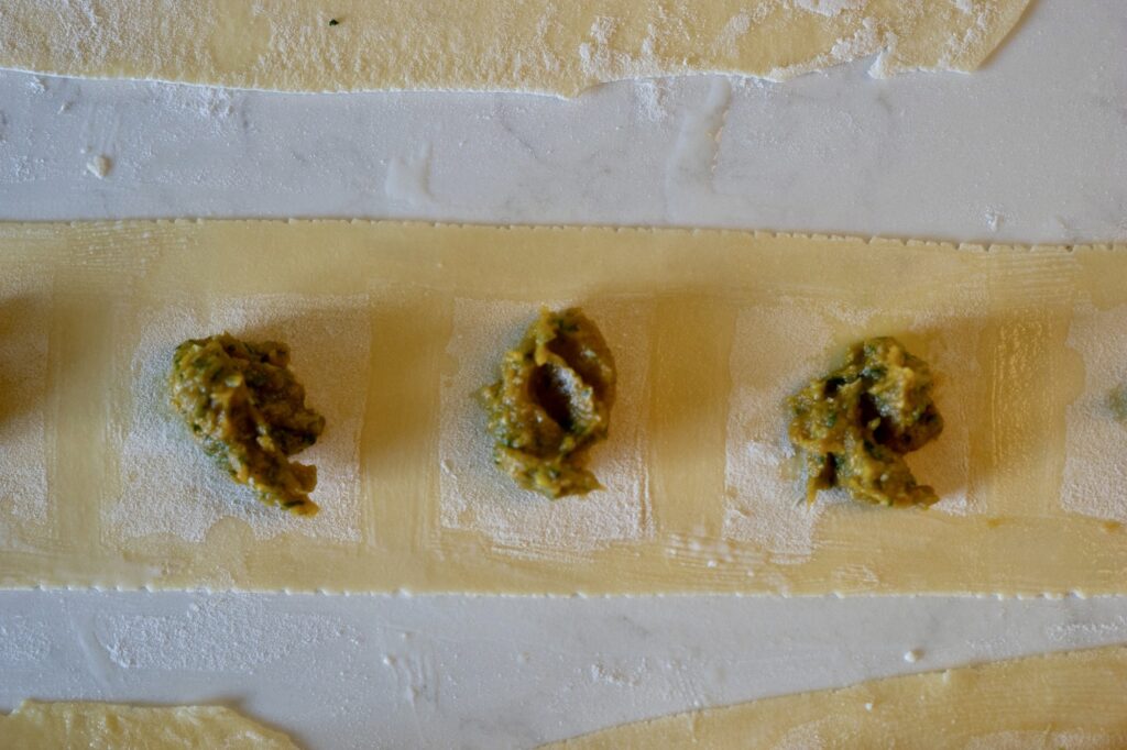 - Leg het deeg op de werkbank. Plaats de vulling in het deeg.
